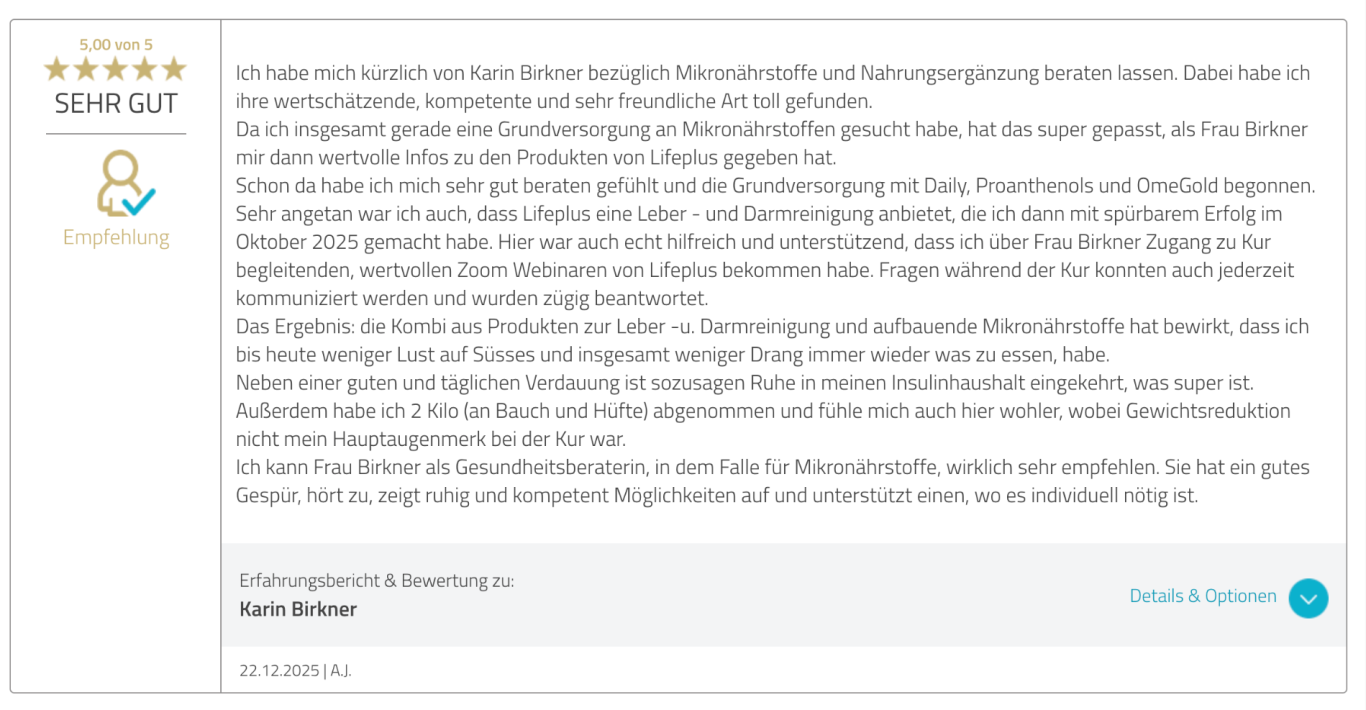 Aus meiner langjährigen eigenen Erfahrung und aus der Begleitung meiner Klientinnen hat sich für mich LifePlus bewährt.